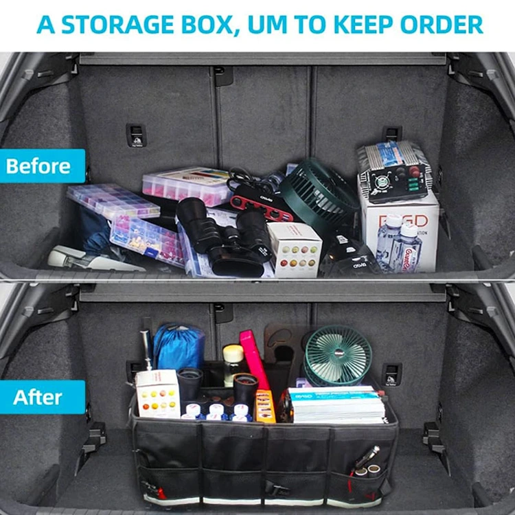 Drie hoofdcompartimenten organiseren gereedschap, voedsel, sportuitrusting, schoonmaakmiddelen en noodartikelen. In de vier zijvakken van mesh passen kleine spullen, zoals handdoeken of kaarten. Een vak met deksel aan de voorkant beveiligt prullaria. Het past op vrachtwagens, sedans, SUV's, bestelwagens en vrijwel elk voertuig.