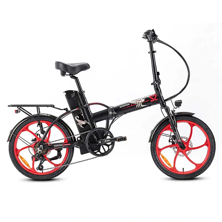 Elegant en krachtig wielontwerp: de opvouwbare elektrische fiets is voorzien van rode, vijfspaaks lichtmetalen velgen met een opvallend profiel. Deze wielen staan voor zowel stijl als kracht, en zijn voorzien van een betrouwbaar schijfremsysteem voor moeiteloze en veilige remprestaties.
