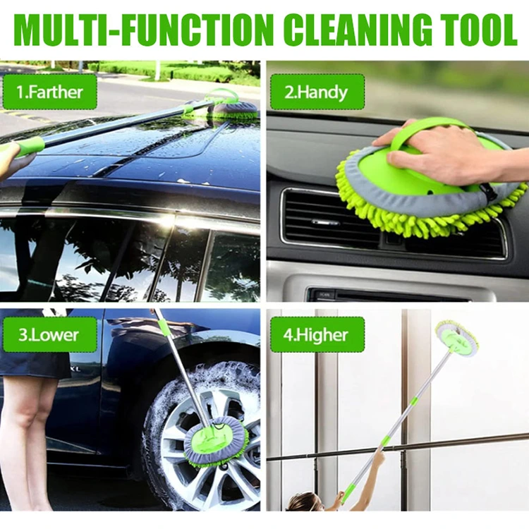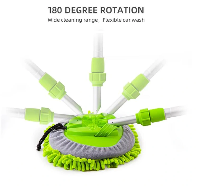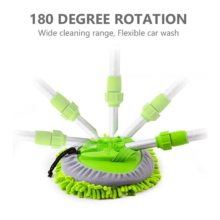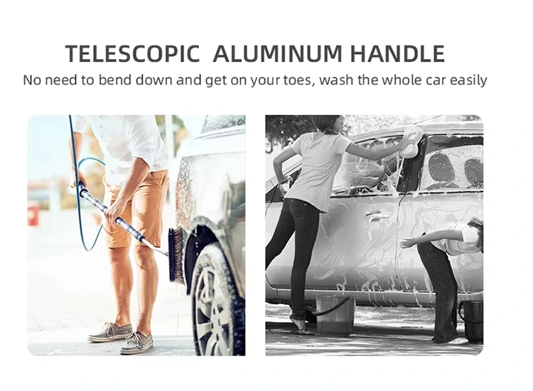 De telescopische autowasmop, ook wel waterstroomborstel genoemd, maakt het wassen van auto's eenvoudiger en efficiënter. U hoeft niet te bukken of een wateremmer te dragen; sluit een slang aan op de bovenkant van het handvat en het water stroomt rechtstreeks door de borstel. De telescopische aluminium handgreep kan worden uitgeschoven om hoge gebieden te bereiken en kan volledig worden losgemaakt voor het close-up reinigen van auto-oppervlakken en ramen. De handgreep draait ook 180 graden, zodat u de reinigingshoek kunt aanpassen voor een betere dekking en gemak.